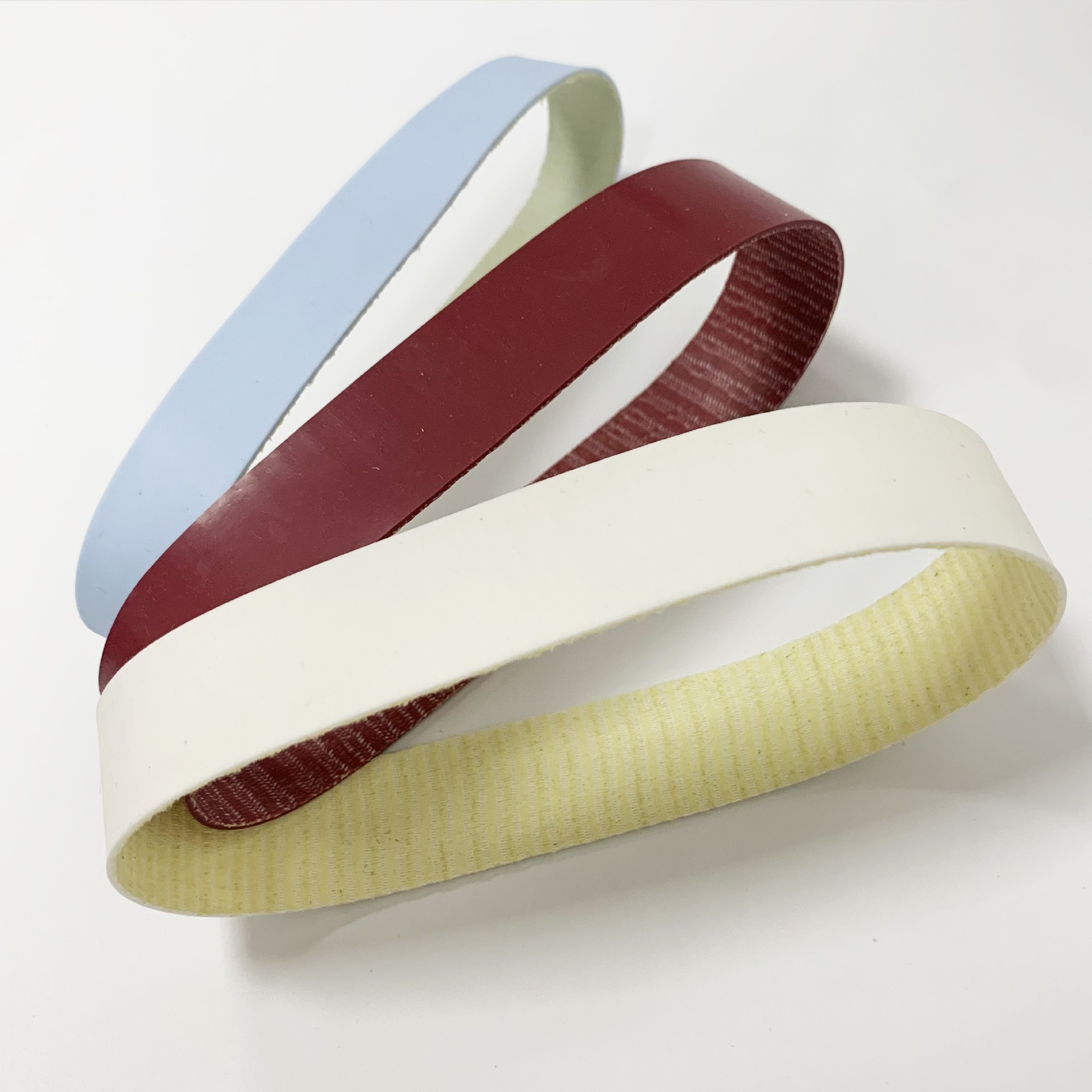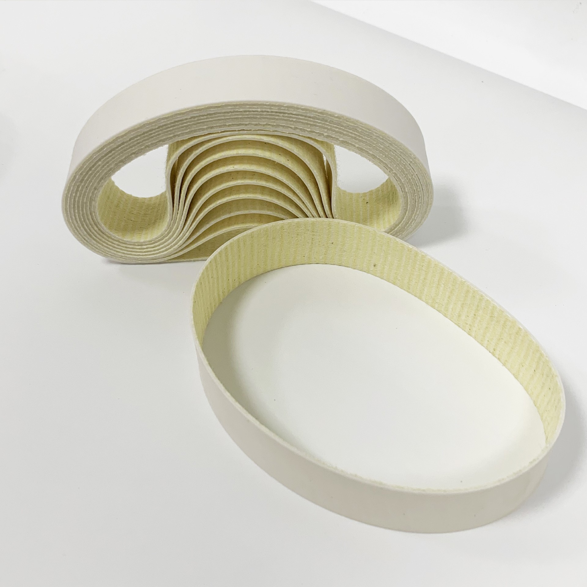 (1)矽膠無縫皮帶富有彈性,做薄料很合適,加熱接觸麵很長,粘膠有充分的時間,熔入布料(liào)的深的處,粘(zhān)合更牢固,而且加熱過(guò)程較長,粘膠是慢慢低溫熔合(hé)的,布料沒有(yǒu)受到高溫損(sǔn)和變色。做薄料比平整,適合做圍和褲的批位等。